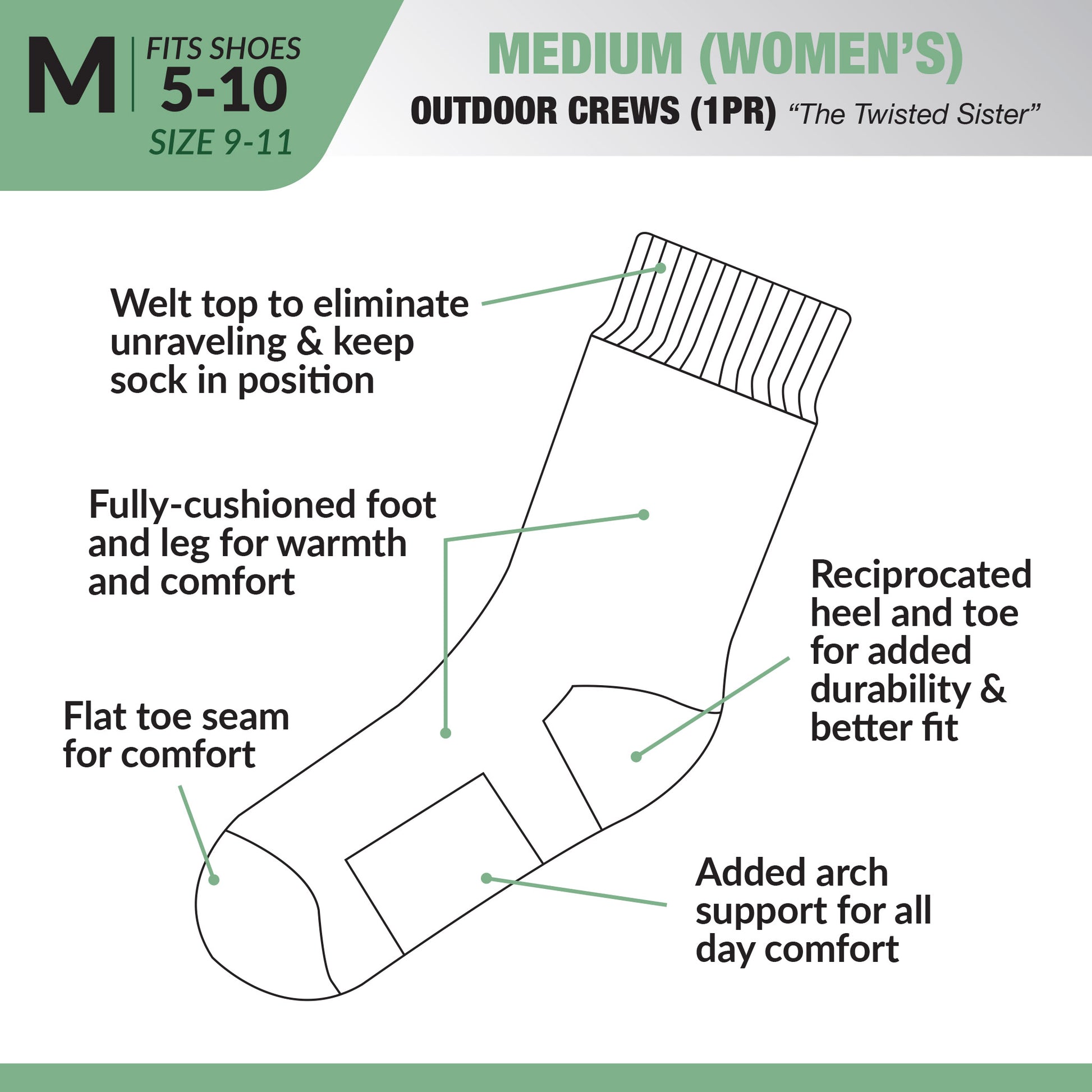 Designed for Camping, Hunting, & Riding, the "Twisted Sister" Outdoor Socks are fully cushioned and feature a stay-up welt top, and a flat, no-show toe seam for superior comfort. Constructed of soft Spun Polyester for just the right mix of comfort and durability. They're mid-weight for any season & moisture wicking to keep your feet dry. The reinforced heel and toe, plus added arch support, ensures your adventures last all day.